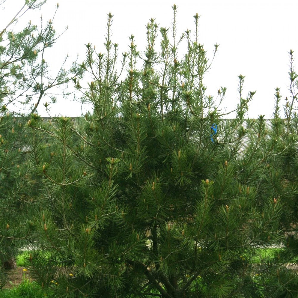 Дерево висотою в дорослому віці до 24 - 30 м, в 10-ти річному віці 2 - 3 м. Крона може змінюватися від пірамідальної до округлої, з віком з плоскою вершиною. Стовбур діаметром до 1 м, часто дерево буває багатостовбурним. Кора гладенька, сіро-зелена, з віком сірувато-біла, крейдяно-біла, іноді з рудуватими плямами, розслоюється на луски. Хвоя голчаста, жорстка, темно-зелена, довжиною 8 - 15 см, діаметром 0,5 - 2 мм, зібрана в пучки по 3 шт. Тримається до 3 - 4 років. Шишки яйцевидні, світло-бурі, смолисті, одиночні або зібрані парами, довжиною 5 - 6 см, діаметром 4 - 5 см, на лусках з відігнутими колючками. Дозрівають шишки в вересні - жовті, на 2-ий рік після запилення. Насіння довжиною 8 - 10 мм, з коротким крилом. Насіння їстівне. Темп росту середній. Щорічний приріст становить 30 - 40 см у висоту.