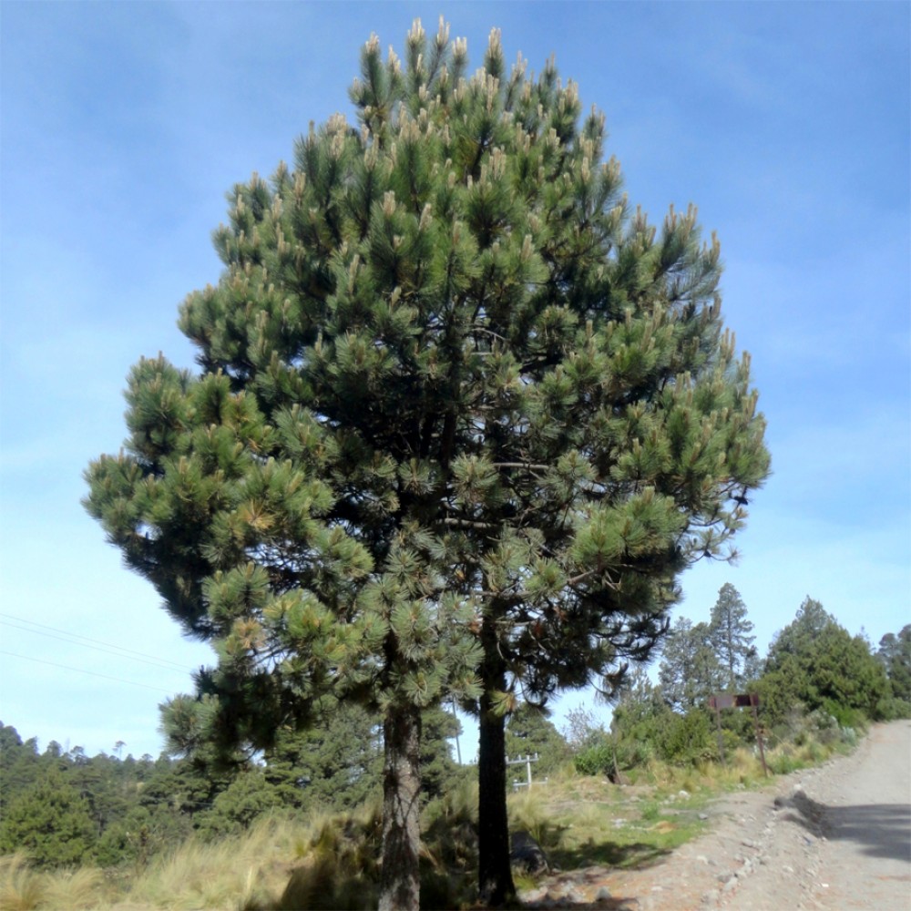 Дерево висотою до 20 - 30 м. Крона широка, округла. Стовбур діаметром до 1,3 м. Кора товста, темно-коричнева або сіра, глибоко-борозниста або луската. Гілки жорсткі, зігнуті догори. Хвоя голчаста, темно-зелена, пряма або зігнута, довжиною 10 - 20 см, товщиною 1 - 1,5 мм, зібрана в пучки по 5, іноді по 3 або по 4 шт. Шишки яйцевидної форми, коричневі, коричнево-фіолетові, темно-фіолетові або чорні, довжиною 8 - 12 (15) см, при розкриванні діаметром 5 - 7 см. Дозрівають через 20 - 22 місяці після запилення. Насіння довжиною 5 - 6 мм, з крилом довжиною 1,5 - 2,5 см.
